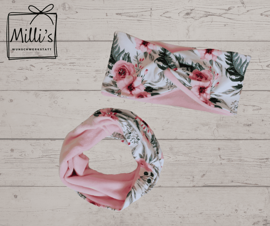Das Set enthält ein passendes Stirnband und einen Loop, die individuell nach Stoffwahl und Kopfumfang personalisiert werden können.